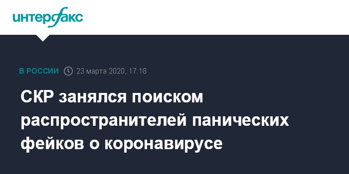 Москва. 23 марта. INTERFAX.RU - Следственный комитет России (СКР) намерен выявить тех, кто распространяет недостоверную информацию о заболеваемости коронавирусом в России с целью посеять панику, сообщили в пресс-службе ведомства.