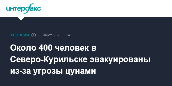 Москва. 25 марта. INTERFAX.RU - Около 400 человек были эвакуированы в безопасное место в Северо-Курильске из-за угрозы цунами после сильного землетрясения, сообщили "Интерфаксу" в пресс-службе МЧС РФ в среду.