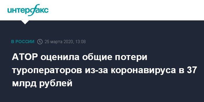 "По нашим оценкам, если ситуация идет по пессимистическому сценарию и до сентября большинство направлений не откроется, мы можем сказать, сколько будет недополученный доход туроператоров. По выездному туризму недополученный доход туроператоров мы оцениваем в 25 млрд рублей, по въездному - порядка 12 млрд рублей", - сказала она.