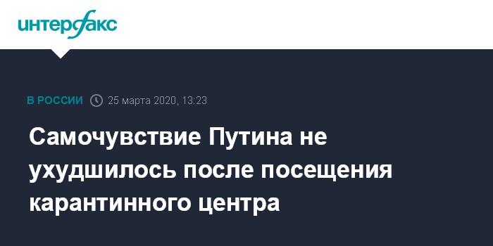 Москва. 25 марта. INTERFAX.RU - Президент РФ Владимир Путин, посетивший во вторник больницу в Коммунарке (Новая Москва), где находится карантинный центр по коронавирусу, чувствует себя нормально.