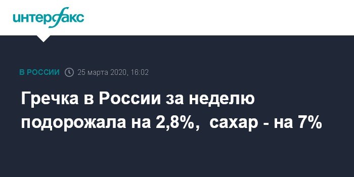 Москва. 25 марта. INTERFAX.RU - Цены на сахар на минувшей неделе в РФ повысились на 7%, гречка подорожала на 2,8%, сообщил Росстат.