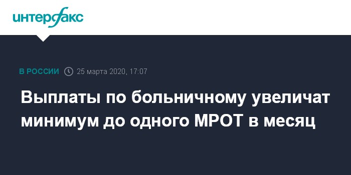 Москва. 25 марта. INTERFAX.RU - Президент России Владимир Путин предложил увеличить нормы выплат по листку нетрудоспособности, чтобы они были не менее одного минимального размера оплаты труда (МРОТ) в месяц, такая мера может действовать до конца текущего года.