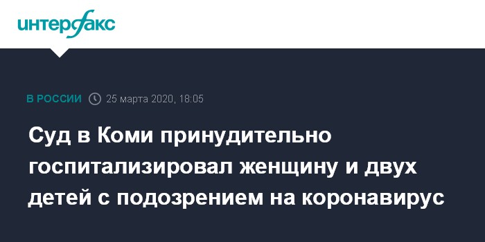 Москва. 25 марта. INTERFAX.RU - Усинский горсуд удовлетворил исковое заявление управления Роспотребнадзора по Коми о принудительной госпитализации трех местных жителей с симптомами острого вирусного заболевания, не исключающие новую коронавирусную инфекцию.
