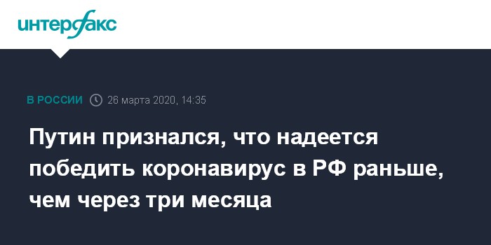 Москва. 26 марта. INTERFAX.RU - Президент РФ Владимир Путин высказал надежду, что Россия может справиться с коронавирусной инфекцией раньше, чем через три месяца.
