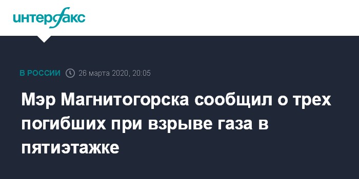 Москва. 26 марта. INTERFAX.RU - После взрыва газа в квартире жилого дома, по предварительной информации, три человека погибли и двое пострадали, сообщил глава Магнитогорска Сергей Бердников журналистам в четверг.