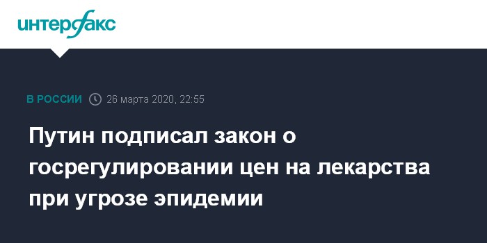 Москва. 26 марта. INTERFAX.RU - Президент РФ Владимир Путин подписал закон, который наделяет правительство правом ограничивать максимальные цены на нежизненно важные лекарства и медицинские изделия в случае угроз распространения эпидемий, подобной коронавирусу, или при чрезвычайных ситуациях.
