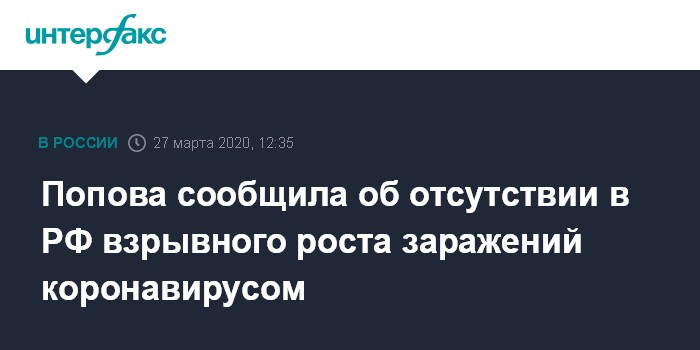 Москва. 27 марта. INTERFAX.RU - Коронавирус распространяется в России спокойными темпами, взрывной рост числа заболевших не наблюдается, сообщила глава Роспотребнадзора Анна Попова на заседании президиума координационного совета по борьбе с коронавирусом.