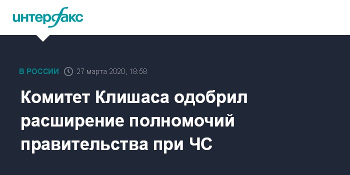 Москва. 27 марта. INTERFAX.RU - Профильный комитет Совета Федерации поддерживает внесенный 26 марта в Госдуму законопроект о расширении полномочий правительства по введению режимов повышенной готовности и чрезвычайной ситуации, сообщил глава комитета Андрей Клишас.