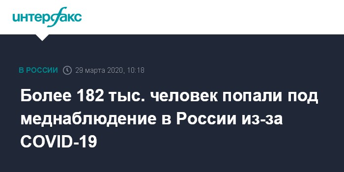 Москва. 29 марта. INTERFAX.RU - Российские медики наблюдают более чем за 182 тыс. человек в рамках мероприятий по недопущению распространения коронавирусной инфекции в стране, сообщает Роспотребнадзор.