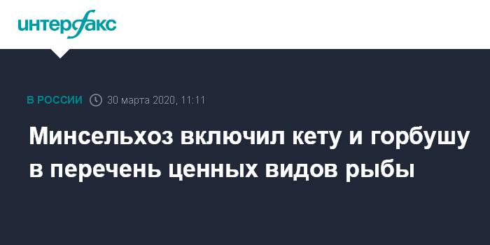 Москва. 30 марта. INTERFAX.RU - Минсельхоз РФ внес изменения в перечень особо ценных и ценных видов водных биологических ресурсов, включив в него кету и горбушу, они отнесены к ценным видам.
