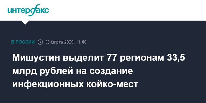 Москва. 30 марта. INTERFAX.RU - Правительтво выделит 77 региона дотацию в 33,5 млрд рублей на создание и оснащение дополнительных инфекционных койко-мест ради лечения больных с COVID-19, сообщил премьер-министр Михаил Мишустин. Он сказал это в президиуме Координационного совета по борьбе с коронавирусом.