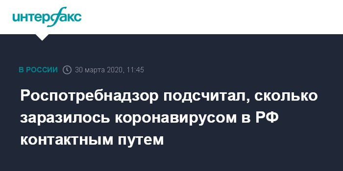 Москва. 30 марта. INTERFAX.RU - Более четверти случаев инфицирования COVID-19 в РФ - контактные, заявила глава Роспотребнадзора Анна Попова.