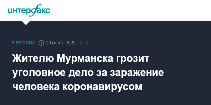 Москва. 30 марта. INTERFAX.RU - В отношении жителя Мурманска могут возбудить уголовное дело за то, что он не ушел на самоизоляцию после поездки за границу, а продолжил свободное общение и заразил несколько человек. Об этом сообщила пресс-секретарь главы Карелии Марина Кабатюк.