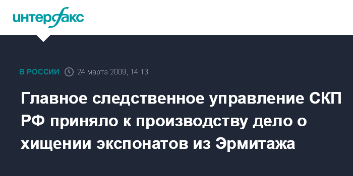 Москва. 24 марта. INTERFAX.RU - Расследованием дела о хищении экспонатов из Эрмитажа займется Главное следственное управление СКП РФ.