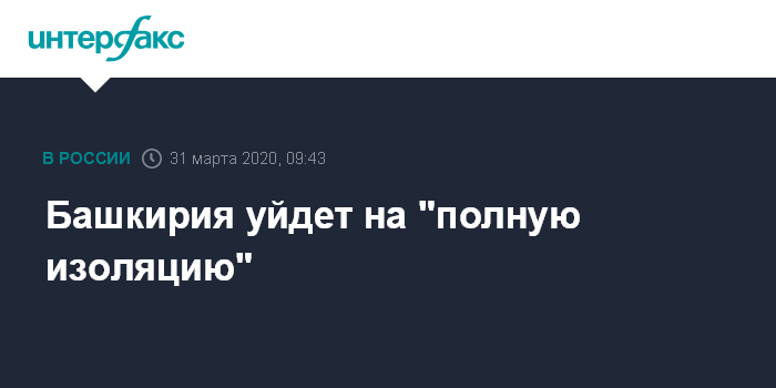 Москва. 31 марта. INTERFAX.RU - Глава Башкирии Радий Хабиров с 20:00 вторника своим указом введет в регионе режим полной самоизоляции всех жителей республики. Он написал об этом в соцсетях и напомнил, что в регионе подтверждено два новых случая заражения коронавирусом.