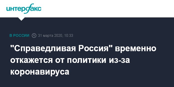 Москва. 31 марта. INTERFAX.RU - "Справедливая Россия" с 31 марта приостановила политическую работу из-за коронавируса и займется тем, что будет помогать гражданам, медикам и волонтерам, объявил лидер партии Сергей Миронов.