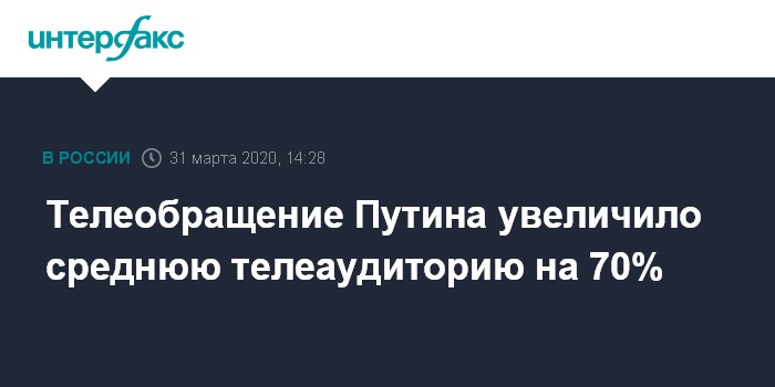 Москва. 31 марта. INTERFAX.RU - Во время выхода в эфир 25 марта телеобращения президента Владимира Путина, телеаудитория выросла почти на 70% по сравнению со средней для этого временного промежутка за первые три недели марта, собщил телеизмеритель Mediascope.