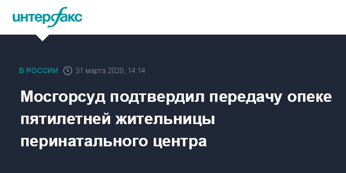 Москва. 31 марта. INTERFAX.RU - Мосгорсуд подтвердил законность решения передать органам опеки девочку, которая с рождения пять лет прожила с нянями в перинатальном центре сети клиник "Мать и дитя", сообщили в пресс-службе суда.