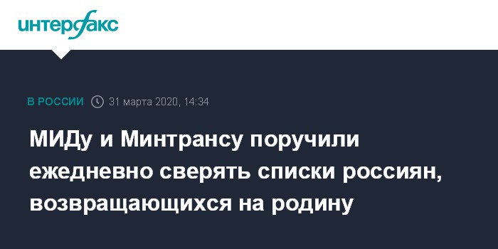 "МИД России, Минтрансу России и Росавиации организовать ежедневную совместную сверку сведений о фактически возвращенных гражданах РФ и о гражданах, заявивших о желании вернуться в Российскую Федерацию", - говорится в поручениях премьер-министра РФ Михаила Мишустина по итогам заседания президиума координационного совета при правительстве по борьбе с коронавирусом.