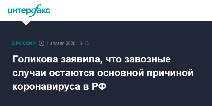 Москва. 1 апреля. INTERFAX.RU - Основной причиной заболеваемости в России коронавирусом по-прежнему остаются завозные случаи из-за рубежа. Об этом сообщила вице-премьер Татьяна Голикова на совещании президента РФ с членами правительства в среду.
