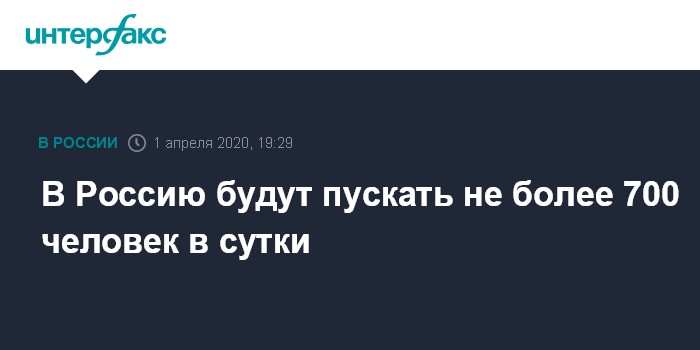 Москва. 1 апреля. INTERFAX.RU - Ежедневно в Россию будут прибывать не более 700 граждан из других стран, но в некоторых случаях могут быть сделаны исключения, заявила вице-премьер Татьяна Голикова. Исключения она связала с решениями других стран, где остаются россияне, желающие вернуться домой.