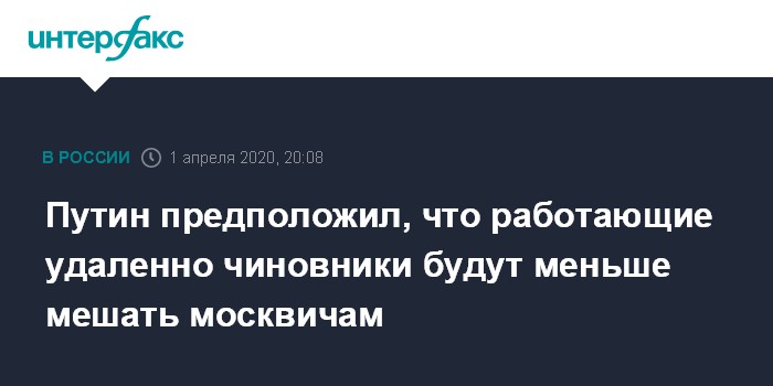 Москва. 1 апреля. INTERFAX.RU - Президент РФ Владимир Путин считает, что новый, дистанционный формат работы руководства страны позитивно отразится на настроении москвичей, поскольку снизит количество машин с мигалками на дорогах