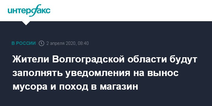 Москва. 2 апреля. INTERFAX.RU - Власти Волгоградской области разработали для жителей региона форму уведомлений, которые им придется заполнять в случае выхода на улицу в режиме самоизоляции, сообщается в телеграме регионального оперативного штаба по борьбе с COVID-19.