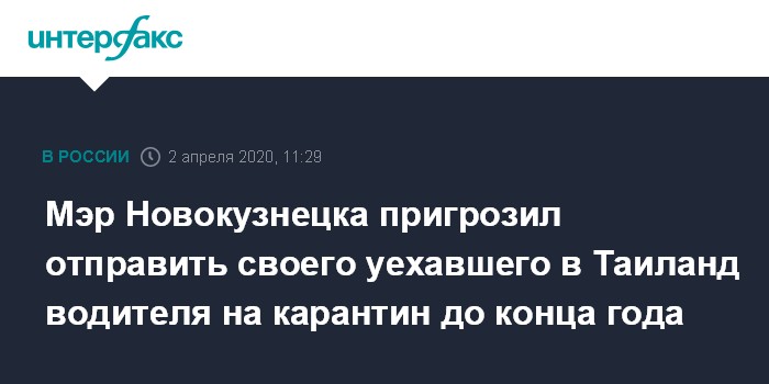 Москва. 2 апреля. INTERFAX.RU - Глава Новокузнецка Сергей Кузнецов резко высказался по поводу своего водителя из-за поездки в Таиланд во время пандемии коронавируса и пообещал оставить его на карантине до конца года.