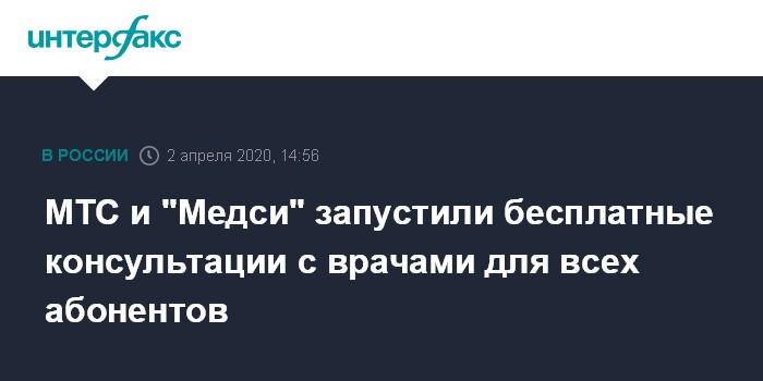 Москва. 2 апреля. INTERFAX.RU - ПАО "МТС" и сеть медицинских клиник "Медси" на месяц запускают бесплатные онлайн-консультации с врачами для абонентов любых операторов связи, говорится в пресс-релизе телеком-компании.