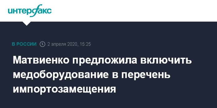 Москва. 2 апреля. INTERFAX.RU - Спикер Совета Федерации Валентина Матвиенко в связи с ситуацией с коронавирусом предлагает включить в программу импортозамещения медицинское оборудование и материалы для производства защитной одежды.