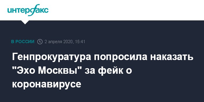 Сайт "Эхо Москвы в Оренбурге" не имеет никакого отношения к радиостанции "Эхо Москвы", а материал, который Генпрокуратура РФ посчитала фейковым, еще в среду был удален, хотя в нем и не упоминался коронавирус, заявил "Интерфаксу" в четверг главред "Эха Москвы" Алексей Венедиктов.