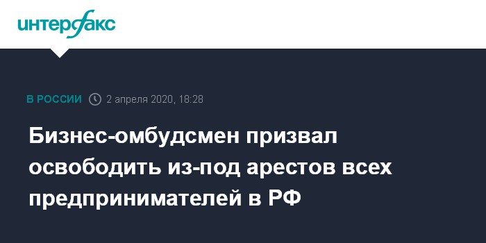 Москва. 2 апреля. INTERFAX.RU - Уполномоченный при президенте РФ по защите прав предпринимателей Борис Титов призвал освободить бизнесменов из-под арестов в связи с изменением работы судов, следствия, а также учреждений ФСИН из-за пандемии COVID-19.