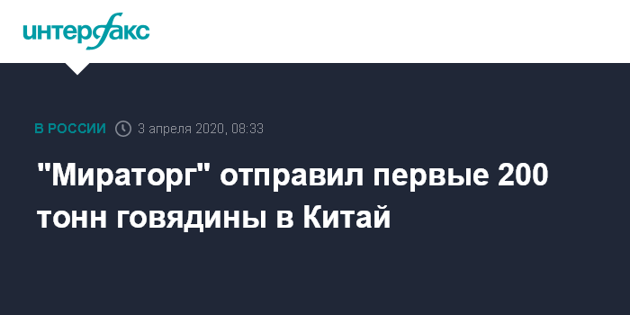 Москва. 3 апреля. INTERFAX.RU - "Мираторг", один из крупнейших производителей свинины и говядины в России, первой из российских компаний приступил к поставкам говядины в Китай.