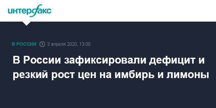 Москва. 3 апреля. INTERFAX.RU - Небывалый спрос на имбирь и лимоны в регионах РФ на фоне ситуации с пандемией коронавируса спровоцировал дефицит и резкий рост цен на них, ритейлеры ожидают новых поступлений из Китая и ЮАР.