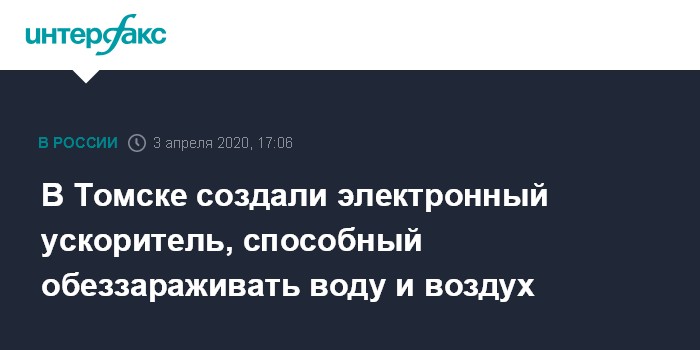 Москва. 3 апреля. INTERFAX.RU - Специалисты Томского политехнического университета (ТПУ) создали установку на основе импульсного ускорителя электронных пучков, которая может использоваться для решения прикладных задач, например, обеззараживания воздуха и воды, сообщила пресс-служба вуза.