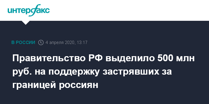 Москва. 4 апреля. INTERFAX.RU - Правительство РФ выделило из резервного фонда 500 млн рублей на социальную поддержку россиян, которые не могут вернуться в Россию из других государств в связи с распространением коронавируса.