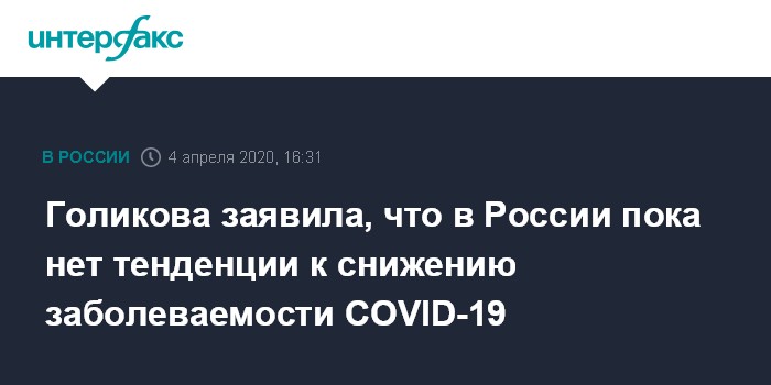 Москва. 4 апреля. INTERFAX.RU - Вице-премьер РФ Татьяна Голикова сообщила, что пока не видит тенденцию на остановку заболеваемости коронавируса.