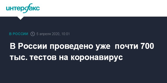 Москва. 5 апреля. INTERFAX.RU - Роспотребнадзор сообщил, по состоянию на 3 апреля в стране проведено более 699 тыс. лабораторных тестов на определение коронавирусной инфекции.