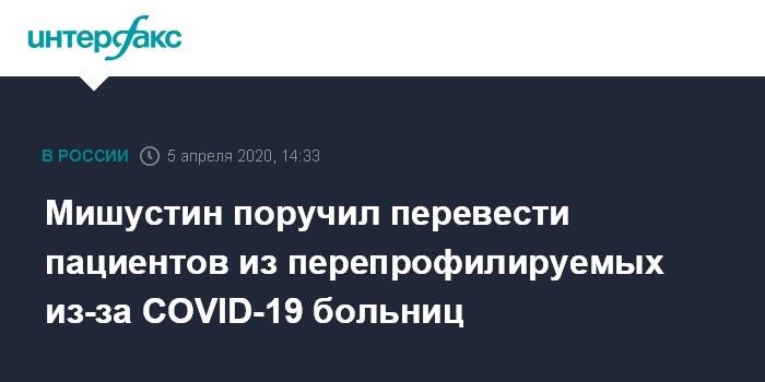 Москва. 5 апреля. INTERFAX.RU - Премьер РФ Михаил Мишустин поручил Минздраву организовать перевод пациентов из федеральных медицинских организаций, планируемых к перепрофилированию в связи с коронавирусом.