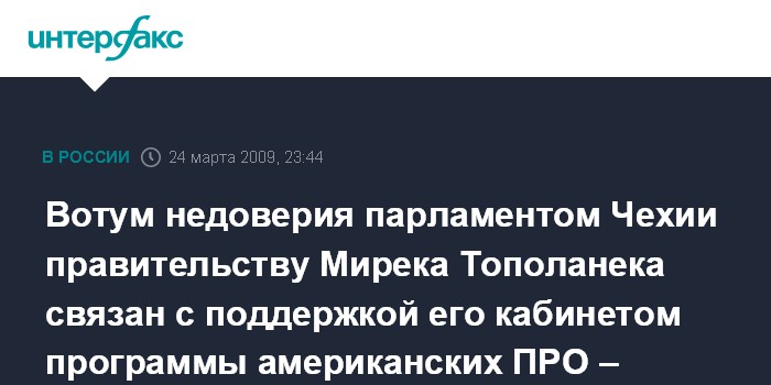 Брюссель. 24 марта. ИНТЕРФАКС - Постпред России при НАТО Дмитрий Рогозин считает, что вынесение вотума недоверия парламентом Чехии правительству Мирека Тополанека не в последнюю очередь связано с поддержкой его кабинетом планов размещения элементов американских систем ПРО на территории страны.