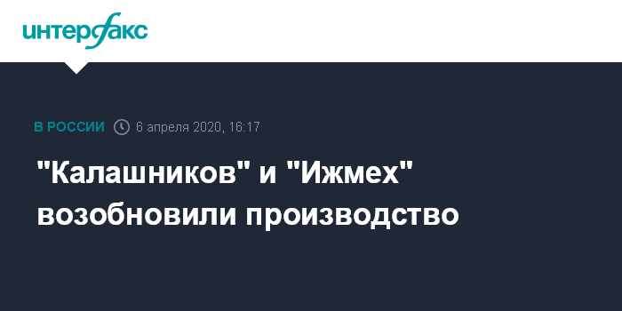 Москва. 6 апреля. INTERFAX.RU - Концерн "Калашников" и Ижевский механический завод возобновили работу 6 апреля после "нерабочей недели", сообщил в фейсбуке управляющий директор концерна Алексей Тенсин.