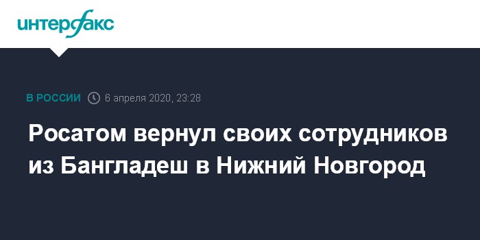 Москва. 6 апреля. INTERFAX.RU - Сотрудники госкорпорации "Росатом" вернулись в Россию из Бангладеш, рейс приземлился в понедельник вечером в нижегородском аэропорту "Стригино", сообщила администрация Нижегородской области.