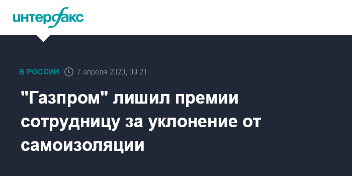 Москва. 7 апреля. INTERFAX.RU - В корпоративной газете структуры "Газпрома" появилась публикация о показательном наказании сотрудницы, которая приехала в Россию в марте с Украины, никому об этом не сообщила и уклонилась от двух недель самоизоляции. Ее лишили премии за март.
