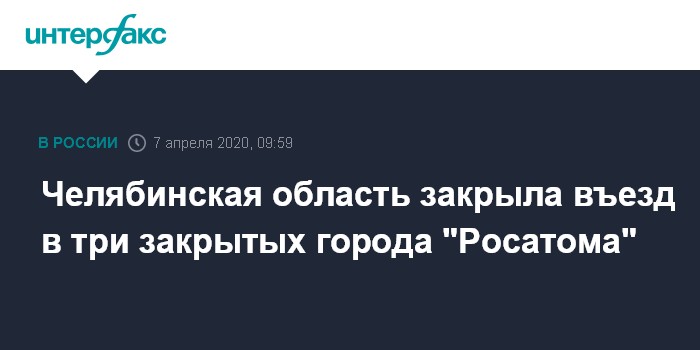Москва. 7 апреля. INTERFAX.RU - Правительство Челябинской области органичило въезд и выезд в три закрытых города (ЗАТО), где находтся предприятия "Росатома", чтобы эти объекты могли работать бесперебойно. Об этом объявил губернатор Алексей Текслер.