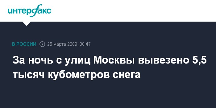 Москва. 25 марта. INTERFAX.RU - На снегосплавные пункты города минувшей ночью было вывезено всего 5,5 тыс. кубометров снега, большая его часть растаяла, сообщил "Интерфаксу" источник в комплексе городского хозяйства в среду.