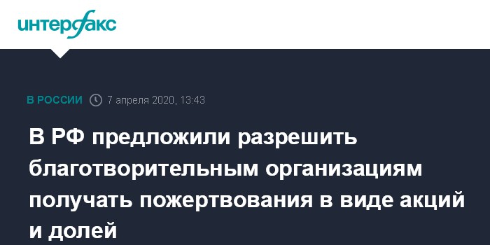 Москва. 7 апреля. INTERFAX.RU - Правительство предлагает разрешить получать благотворительным организациям акции АО или доли в ООО в виде пожертвований.