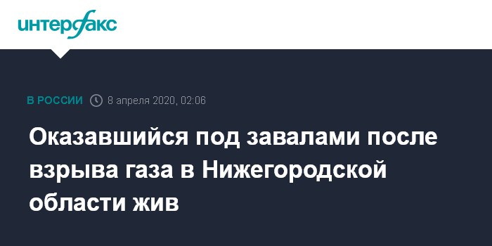 Москва. 8 апреля. INTERFAX.RU - Житель дома в селе Филинское Нижегородской области, оказавшийся под завалами после взрыва газового баллона в доме, подает признаки жизни, сообщил "Интерфаксу" информированный источник.