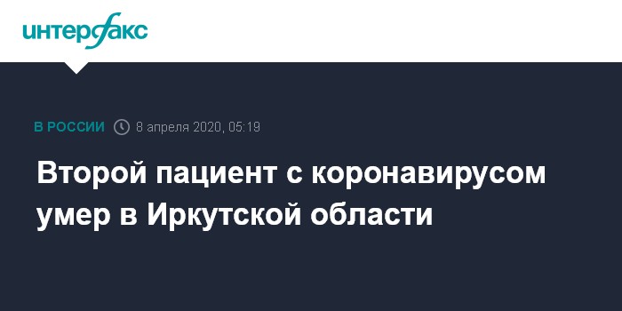Москва. 8 апреля. INTERFAX.RU - Второй случай смерти пациента с коронавирусной инфекцией COVID-19 зарегистрирован в Иркутской области, сообщает оперштаб на сайте регионального минздрава.