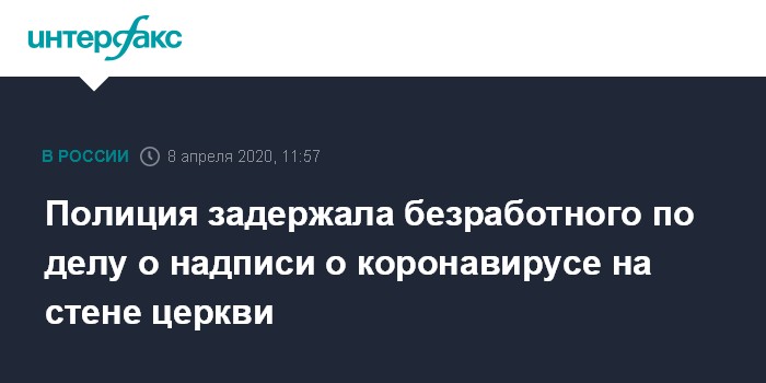 Москва. 8 апреля. INTERFAX.RU - В Петербурге полицейские задержали подозреваемого в причастности к к нанесению надписей о коронавирусе на стену Благовещенской церкви на Васильевском острове. Как сообщили в региональном управлении МВД, это 27-летний безработный, его отпустили под обязательство о явке.