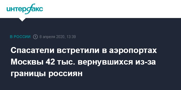 Москва. 8 апреля. INTERFAX.RU - Оперативные группы спасателей, которые работают в московских аэропортах, встретили 42 тысяч граждан России, вернувшихся из-за границы, сообщил заместитель мэра Москвы Петр Бирюков.